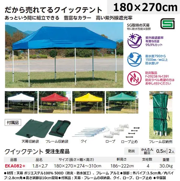 ・材質:天幕 ポリエステル100% 500D(防炎・防水加工)、フレーム アルミ