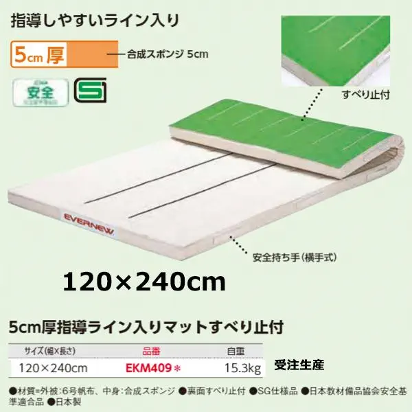 EKM409カテゴリ体操商品名指導ライン入りマット滑止120x240x5商品番号EKM409dummyEKM409指導ライン入りマット滑止120x240x5タイプ:EKM409JANコード:4934048547035取扱い区分:取り寄せ品販売価格85,030円(税込)送料条件基本送料+別途加算の場合有お問い合わせ納期 在庫状況 見積り発注数量 カゴに入れる マイページへ登録 商品 問い合わせ 前転後転などの指導がしやすいライン入りマット。サイズ=長さ240cm×幅120cm×厚さ5cm自重=15.3kg材質=外被:6号帆布/中身:合成スポンジSG仕様品日本教材備品協会安全基準適合品裏面すべり止付日本製