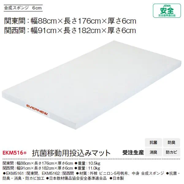 901:#1エバニュー カテゴリ体育館・柔道用具・体力測定商品名抗菌移動用投込みマット商品番号EKM516カラー(901) 関東間カラーバリエーション901:関東間 dummyEKM516抗菌移動用投込みマットカラー:(901) 関東間タイプ:EKM516JANコード:4934048447700取扱い区分:取り寄せ品販売価格48,510円(税込)送料条件基本送料+別途加算の場合有お問い合わせ納期 在庫状況 見積り発注数量 カゴに入れる マイページへ登録 商品 問い合わせ 「サイズをご指定ください」関東間=幅88cm×長さ176cm×厚さ6cm自重=10.5kg関西間=幅91cm×長さ182cm×厚さ6cm自重=11kg材質=外被:ビニロン5号抗菌・防臭帆布、中身:合成スポンジ日本製